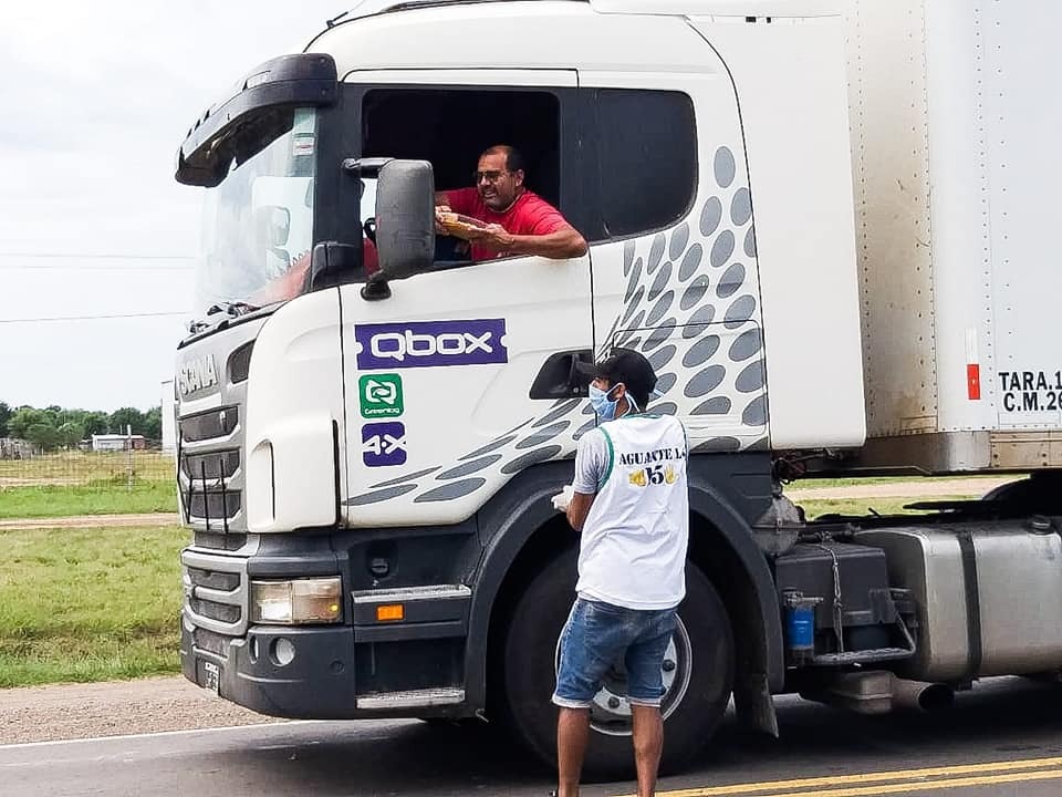 “Nos reunimos con el intendente y con algunos concejales parapoder conseguir los permisos pertinentes para repartir la comida, y une vez que contamos con su apoyo nos pusimos a cocinar”, indicó y agregó “colocamos una carpa en el acceso a la ciudad, y a medida que los camioneros pasaban íbamos entregando unas bandejas con comida para que puedan seguir viaje”.