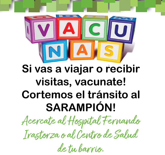 El Hospital Fernando Irastorza, en conjunto con la Dirección de Salud de la Municipalidad de Curuzú Cuatiá, informa a la población en general, que se continúa con la campaña de vacunación contra el sarampión. En nuestra ciudad no se han registrado casos aún, pero, desde ambas instituciones, se está abocado a la tarea de prevenir posibles casos en vísperas de los movimientos turísticos típicos de fin de año. Se recomienda vacunarse con una anticipación de por lo menos 20 días anteriores a un eventual viaje o recepción de visitas.